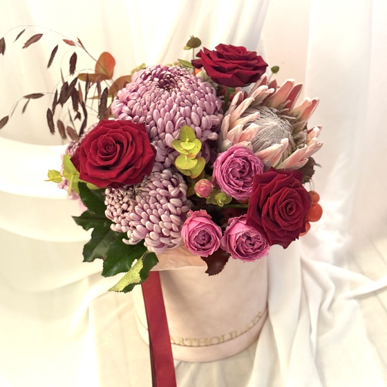 Неймовірне поєднання шляхетних троянд, екзотичної протеї та пухнастих хризантем створює образ, гідний королеви.