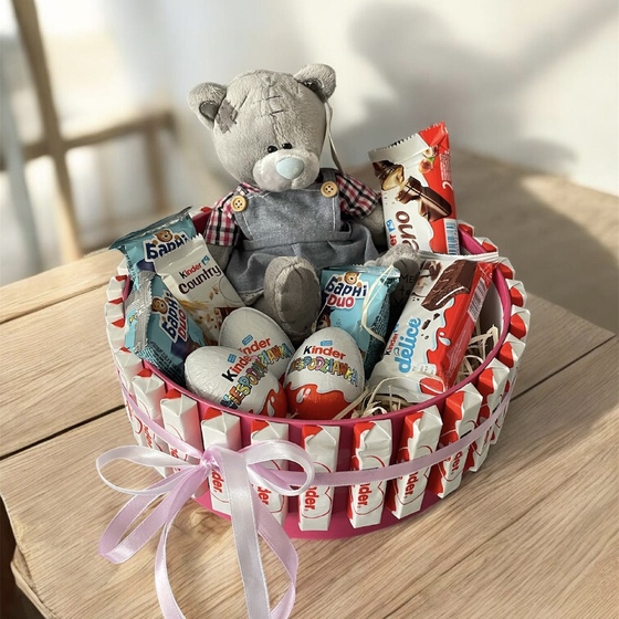 Подарунковий бокс з ведмедиком та солодощами Kinder — яскравий та ніжний сюрприз для дитини або коханої людини.