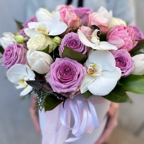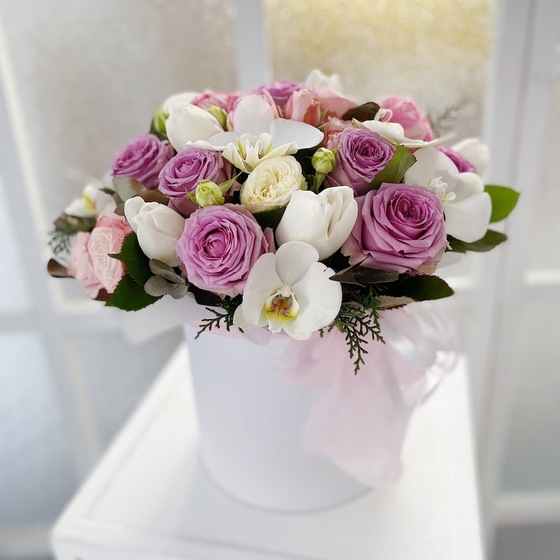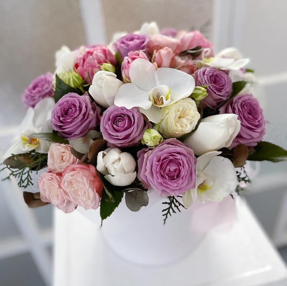 Склад: капелюшна коробка, 9 фіолетових троянд, 3 кущові троянди, 1 біла кущова троянда, 7 білих орхідей, 7 білих тюльпанів, 5 рожевих тюльпанів, евкаліпт, атласна стрічка.