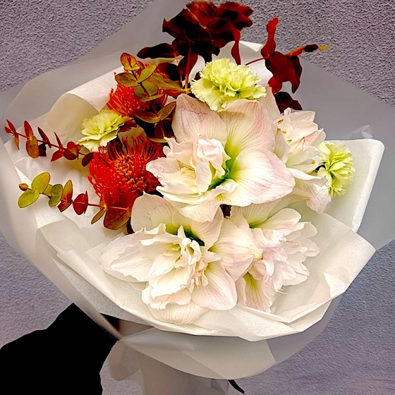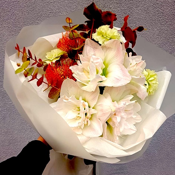 Букет з амарілісу, леукоспермумом, діантусами та зеленню.