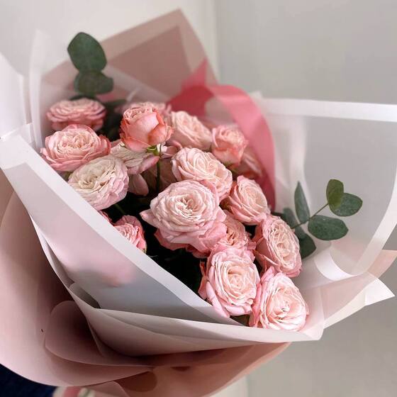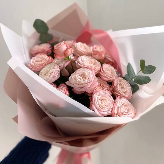 Склад: 5 гілок рожевий кущовий троянди (сорт бомбастик), евкаліпт 3 гілки, упаковка калька двох кольорів.