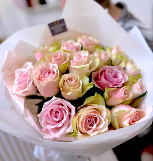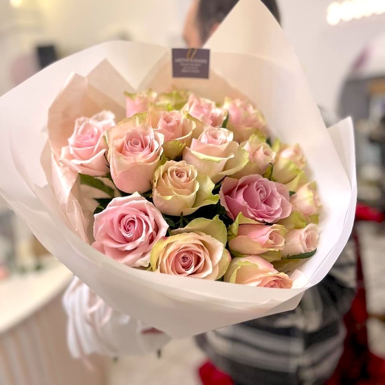 Ніжний букет із класичних одноголових троянд у пастельно-рожевій гамі. Поєднання м’яких рожевих і кремових тонів створює ефект легкої акварелі — букет виглядає витончено, святково та водночас природно. Кожна троянда має щільний бутон із плавним переходом кольору від кремового до рожевого, що додає об’єму й глибини композиції.