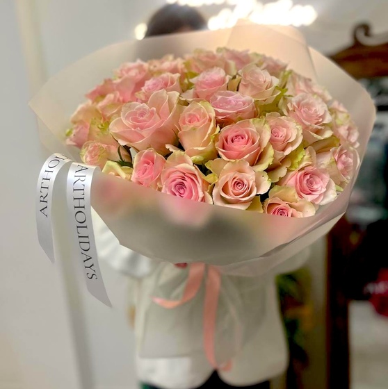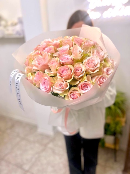 Вишуканий букет у ніжно-рожевих тонах, складений із свіжих троянд з плавним переходом від кремового до пудрового відтінку. Квіти зібрані у стильне матове пакування та доповнені елегантною стрічкою, що підкреслює легкість і витонченість композиції.