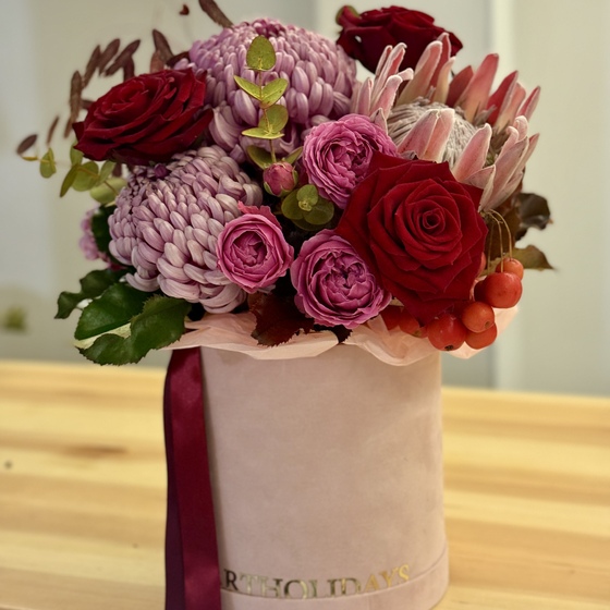 Неймовірне поєднання шляхетних троянд, екзотичної протеї та пухнастих хризантем створює образ, гідний королеви.