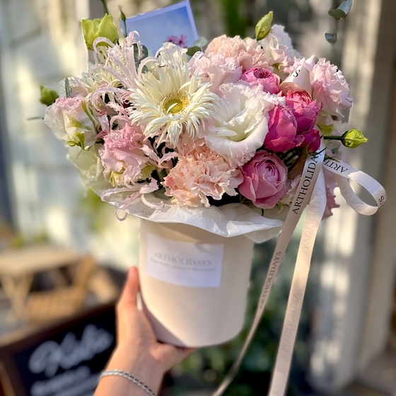 Склад: кущова троянда рожева, гербери білі або рожеві, діантуси пастельні, еустома, капелюшна коробка.