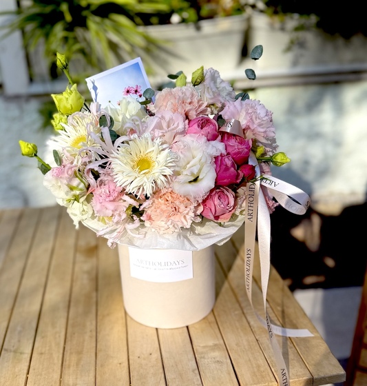 Квіткова коробка — справжнє втілення ніжності та елегантності. У витонченій капелюшній коробці зібрані квіти в пастельних відтінках: ароматні троянди, чарівні еустоми, ніжні гвоздики та витончені гербери. Такий букет у коробці створює атмосферу тепла, радості й турботи.