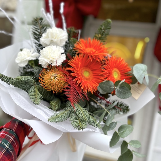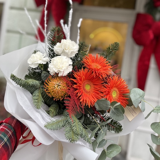 Склад: 3 гербери, 3 діантуси, леукосперум, евкаліпт, нобіліс.