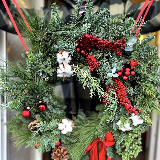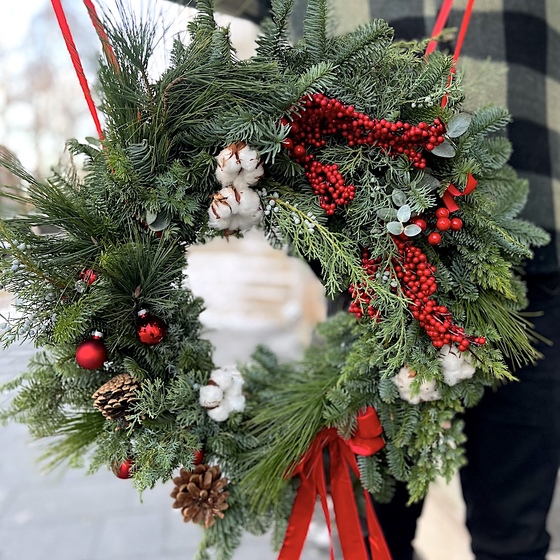 Склад: нобіліс, можевельник, 2 ілекса, 2 гілки бавовни, новорічний декор.