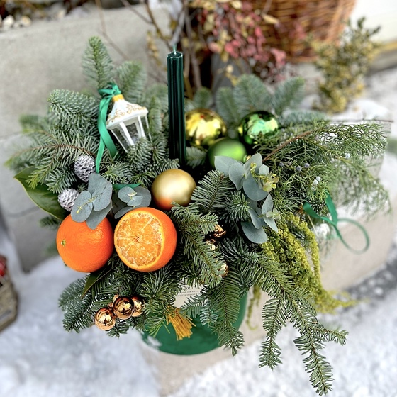Склад: нобіліс, можевельник, 2 мандарини, новорічний декор, коробка з оазисом, 1 свічка.
